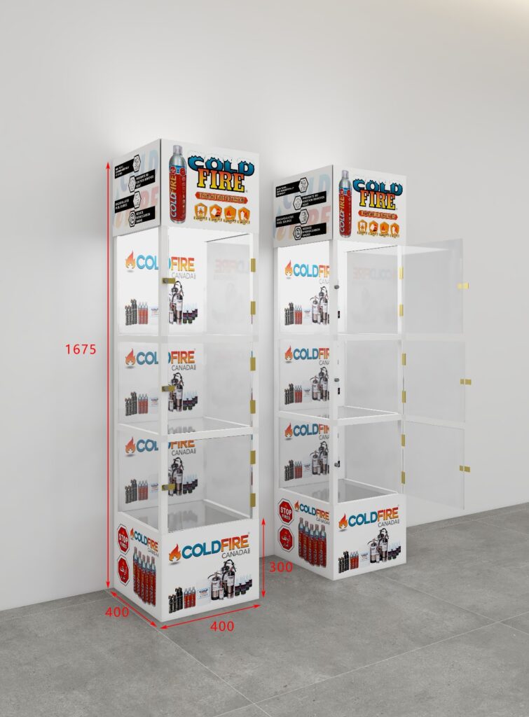 Why use Cold Fire? Non Toxic Environmentally friendly Prevents re-ignition , Removes heat Encapsulates Fuel source Reduce hydro carbon smoke Cold Fire Certifications and approval UL CLASSIFIED C-UL CLASSIFIED : In Compliance with ULC Subj. C175 INTERNATIONAL CREDENTIALS : Certified by various international bodies including the instituto Del Fuego in Chile for Class A, B, C, K and D fires. Aerosol can Display Stand Rapid Cooling Agent Environmentally Friendly Formulation Versatile Fire suppression Capability Location For Cold Fire Display Stand Gas StationsHardware StoresSupermarketsAutomotive ShopsHome Improvement StoresPharmacies